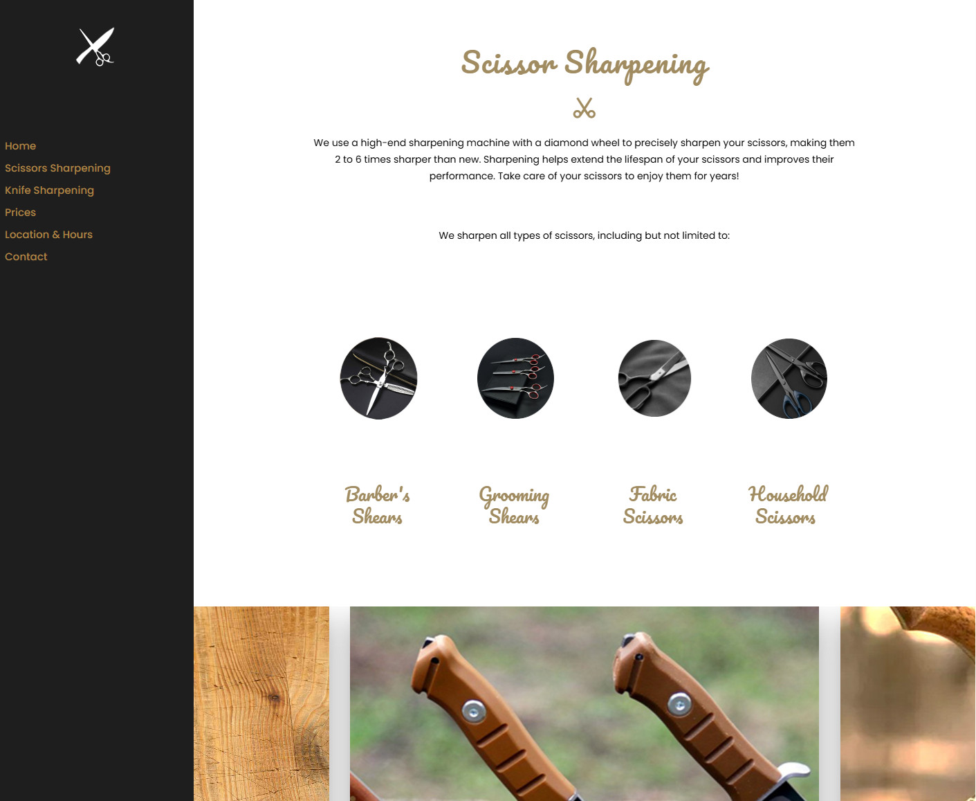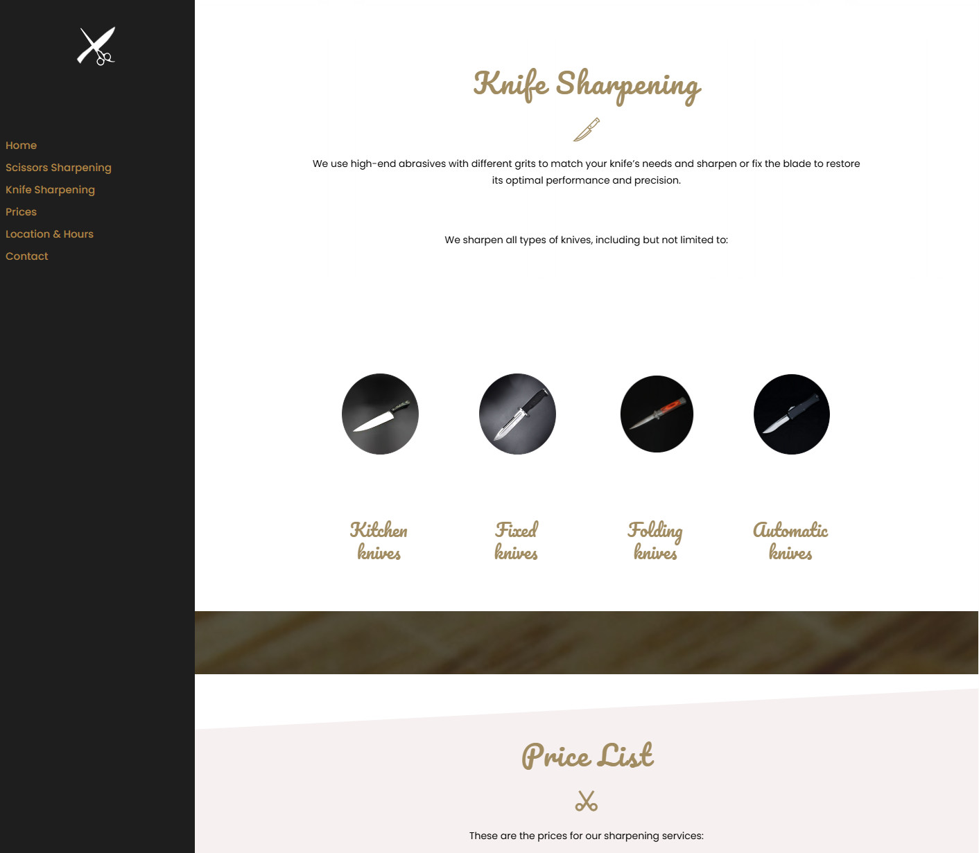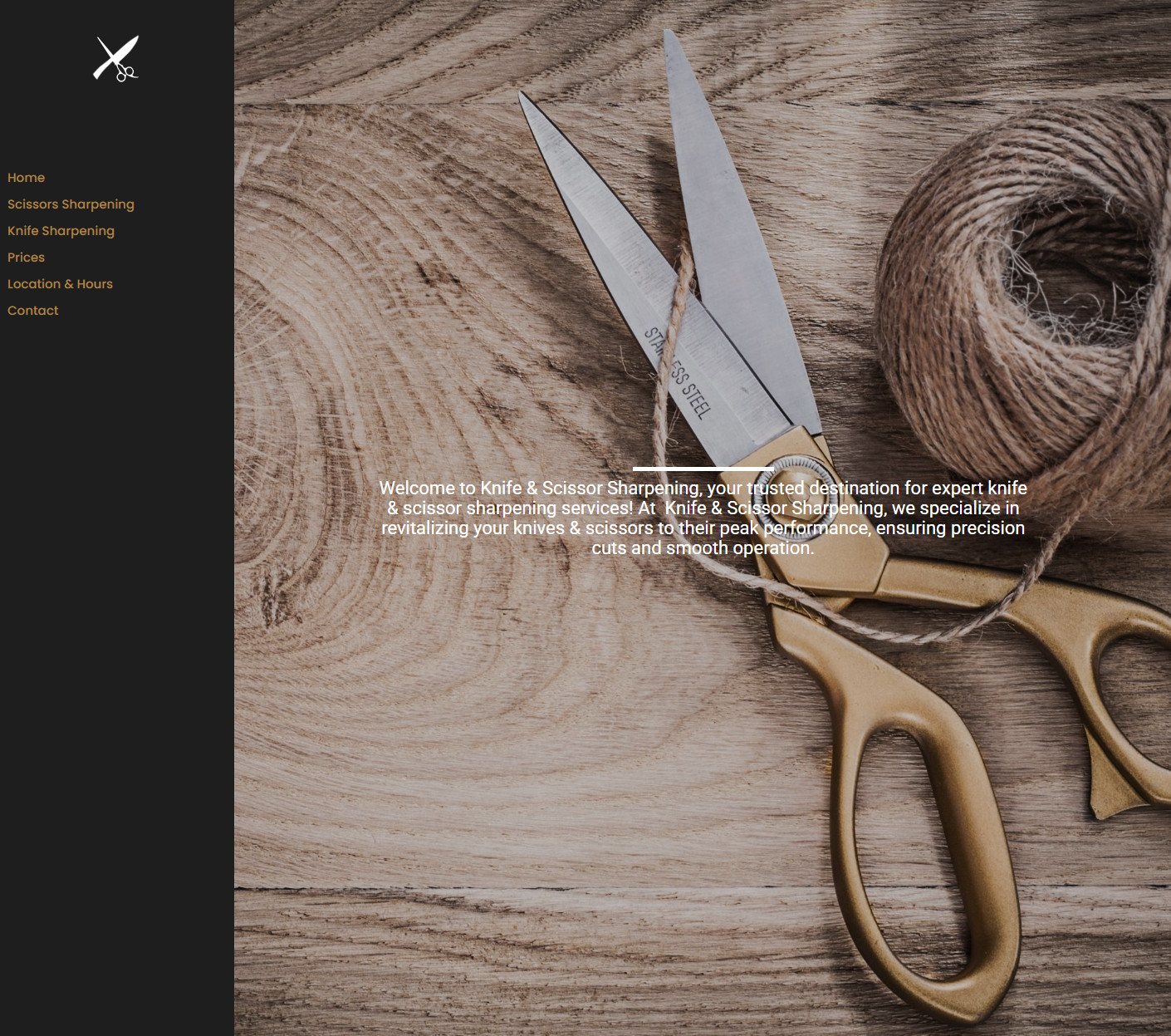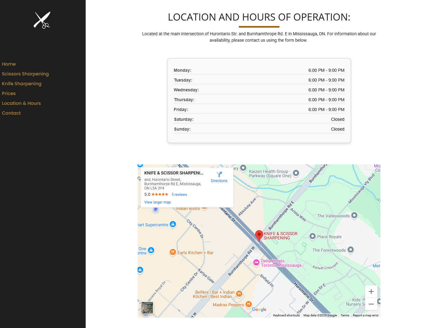 Sharpitup.ca is a knife and scissor sharpening service website built with WordPress. It features a service description, pricing information, a live location map with reviews, and a contact form.